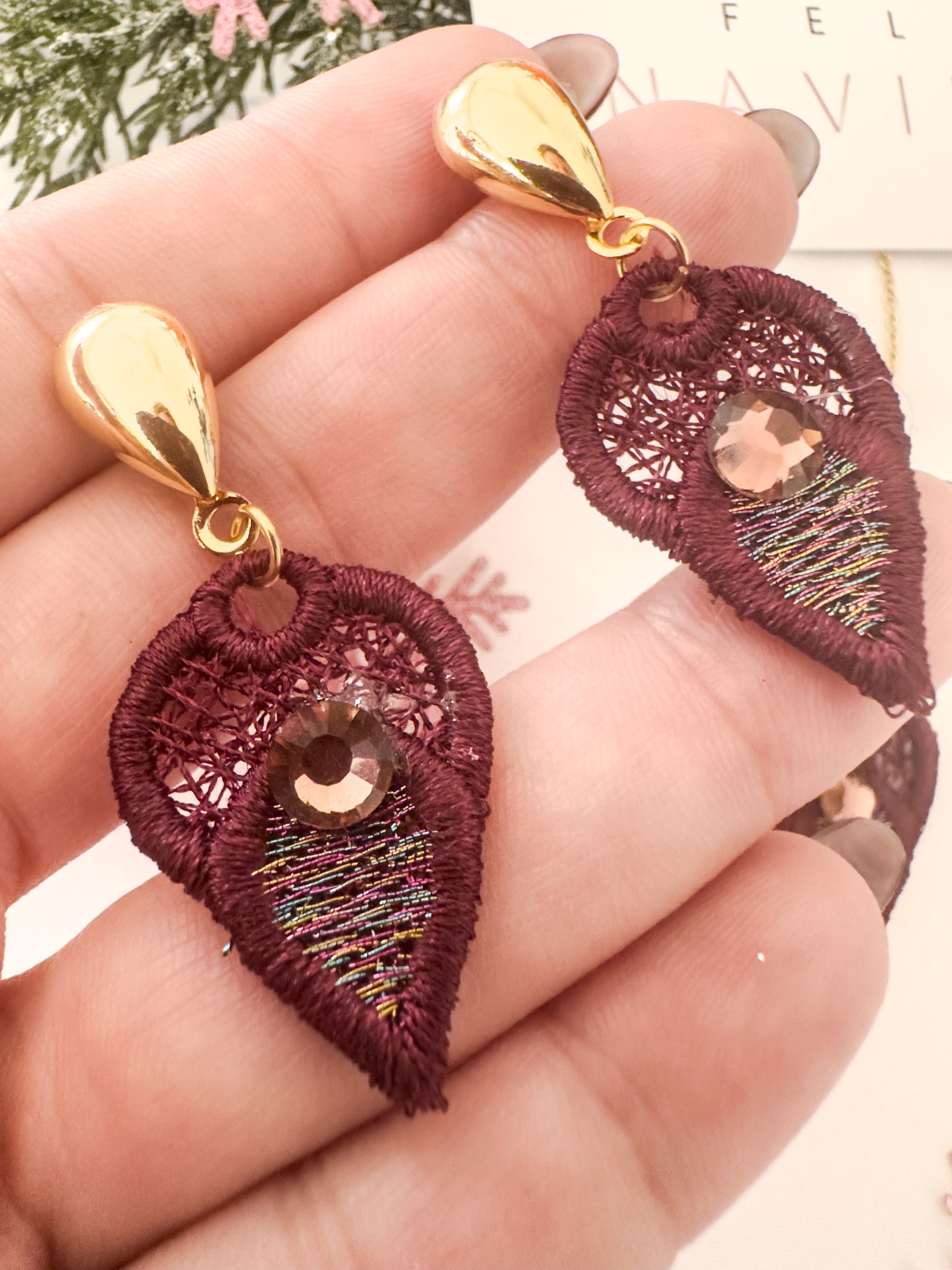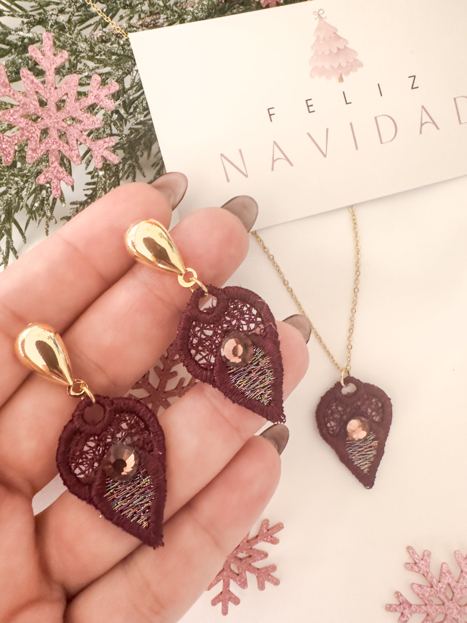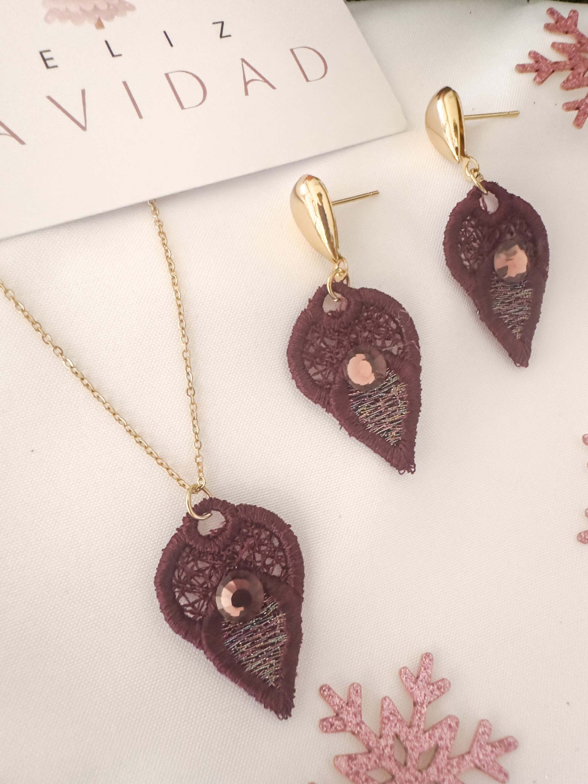 - Set incluye pantallas (aretes) y collar.