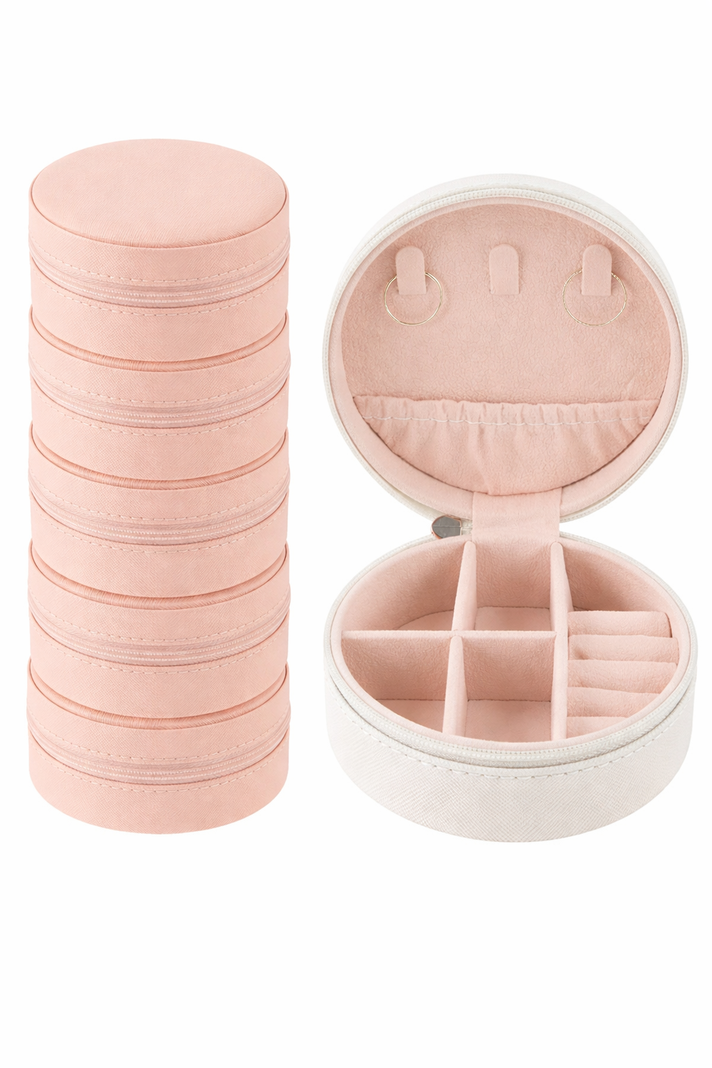 Este joyero compacto y elegante está diseñado para acompañarte a donde vayas. Su interior suave y organizado protege tus pantallas, collares y pulseras, mientras su exterior resistente mantiene todo seguro dentro de tu cartera o carry-on.